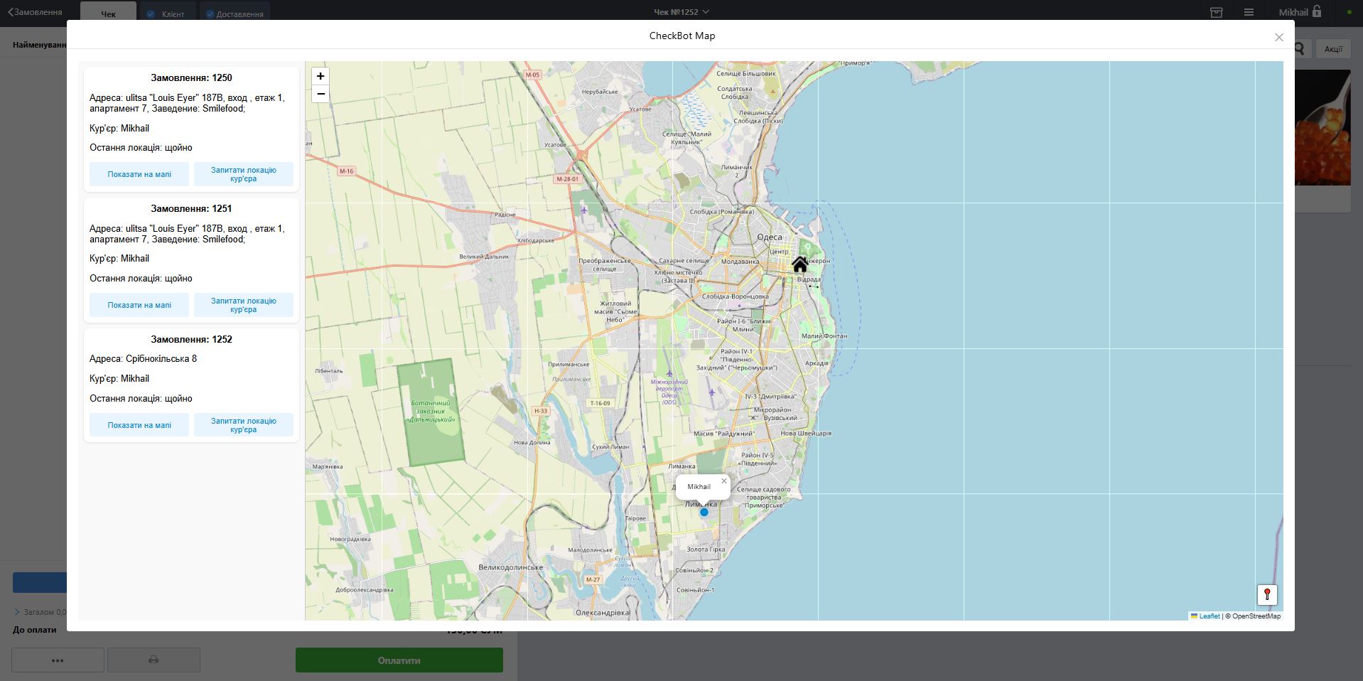 Оператор видит на карте где находится курьер по геопозиции. Может отправить автоматически новый заказ ему в Telegram