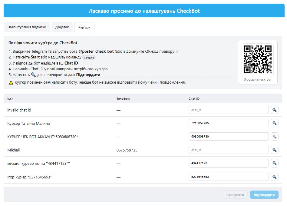 – Укажите этот ID в карточке курьера: Админ-панель Poster → Приложения → Courier Bot → вкладка «Курьеры»