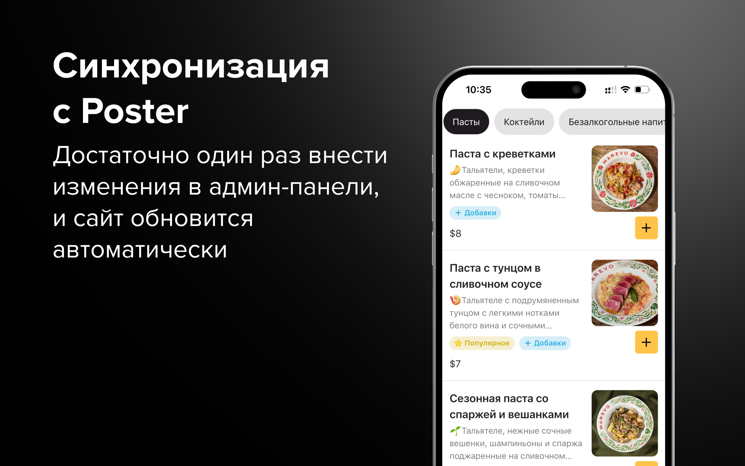 Гости смогут посмотреть меню и заказать блюда на доставку или навынос. Заказы с подробной информацией для курьера будут поступать прямо на кассу Poster.