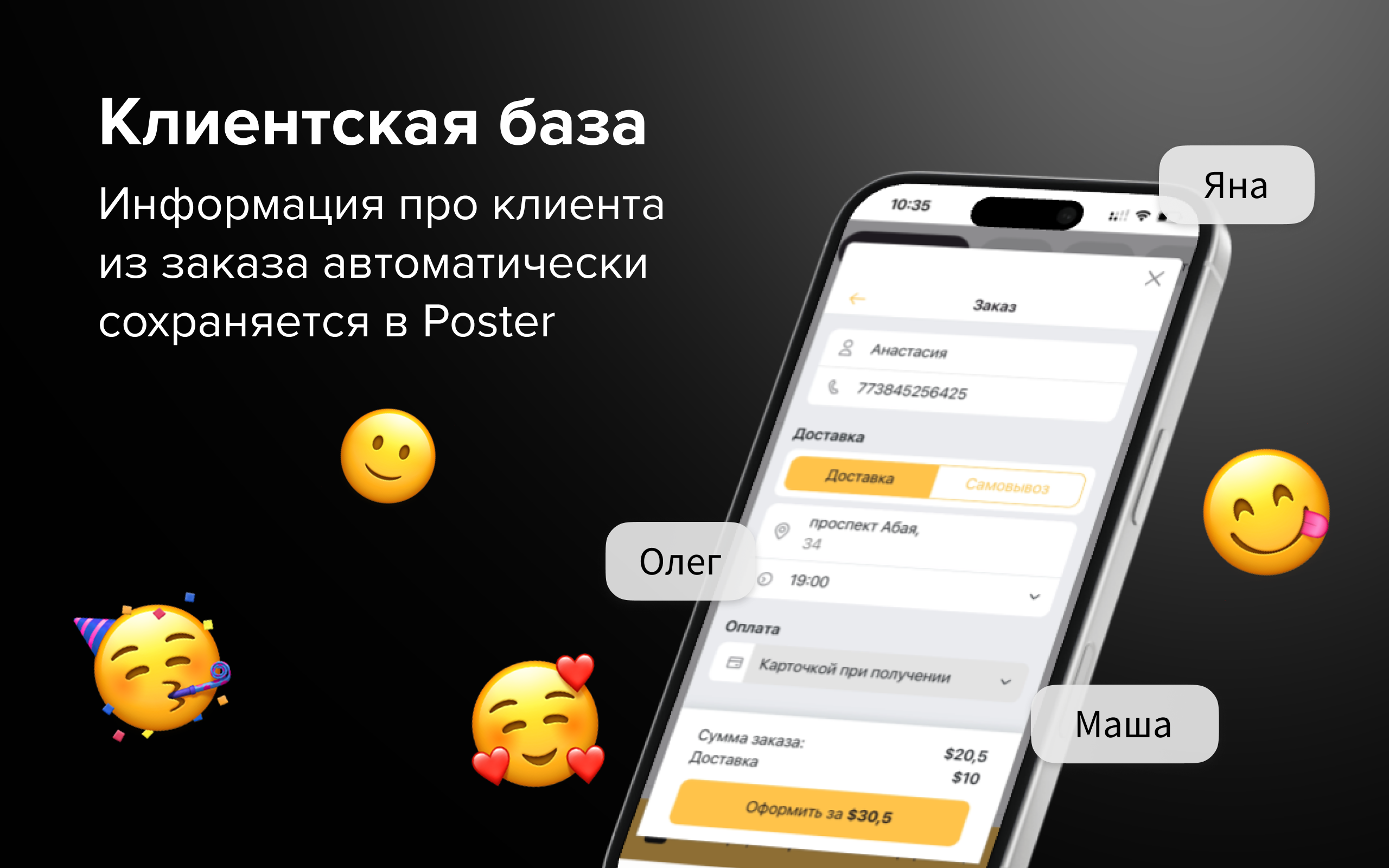 Принимайте заказы на доставку и самовывоз, настройте оплату картой на сайте или во время получения заказа. Заказы с детальной информацией для курьера будут приходить прямо на кассу Poster.
