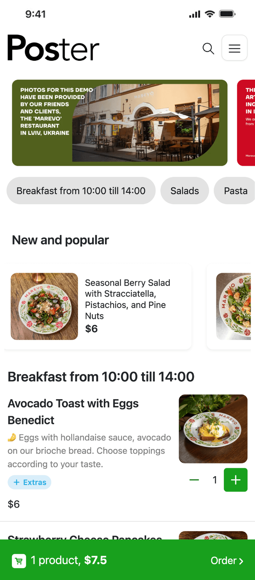 Create a contactless QR menu for your restaurant or cafe with Poster QR. Easy online menu just a QR code away.