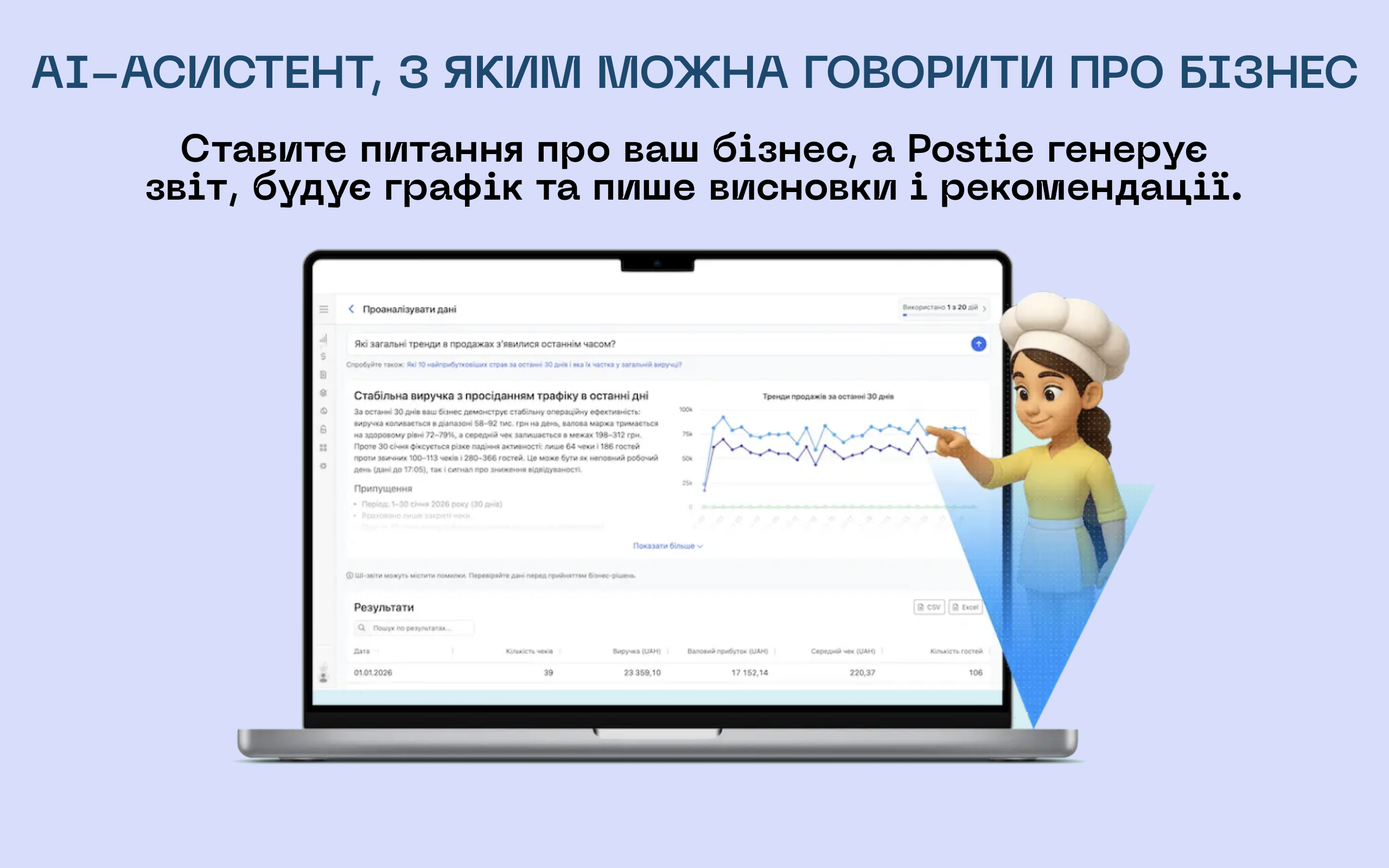 Postie AI відповідає на питання про ефективність закладу, будує прогнози продажів та автоматично оцифровує накладні й виписки.